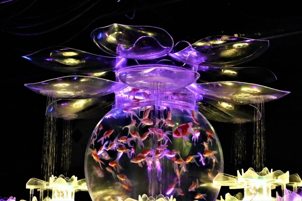色々な光の中で優雅に泳ぐ金魚の姿に魅力されました。