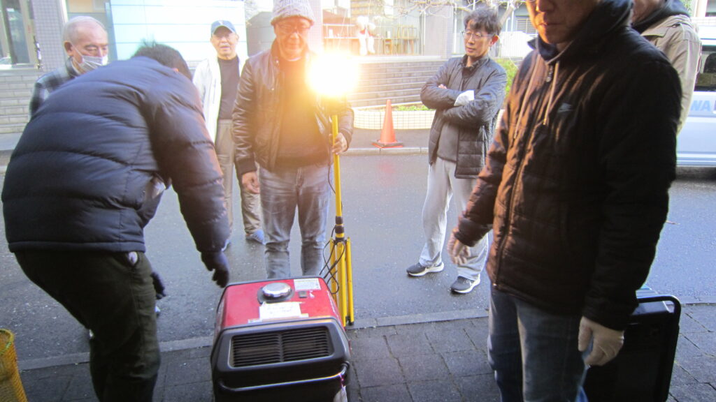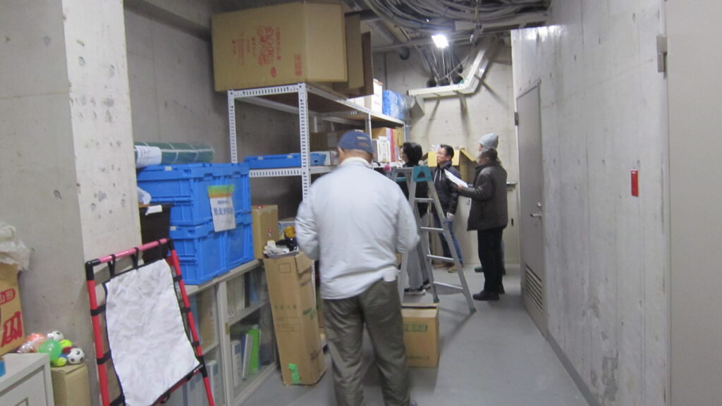 地上の防災倉庫、地下倉庫、2階キッチンスタジアム、2階自動販売機の部屋、14階防災倉庫、最後に発電機(1階ゴミ倉庫に保管)の始動確認の順に整理してあります。