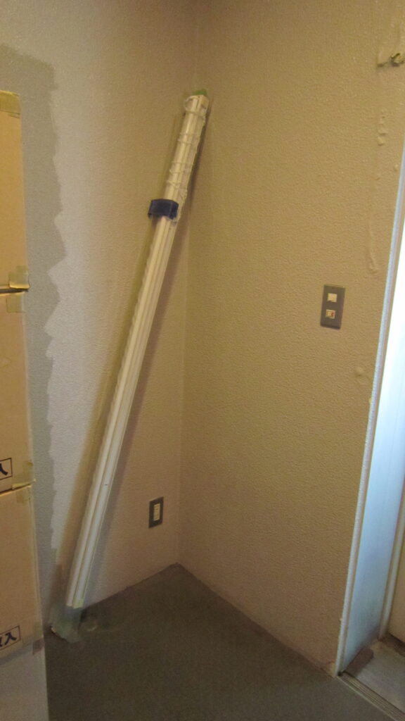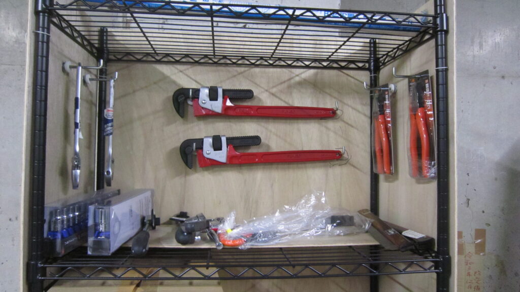 キッチンスタジアムの壁部分のラックに防災備品・用品を保管しています。まさかの時すぐ使えるよう緊急性の高いものを保管しています。