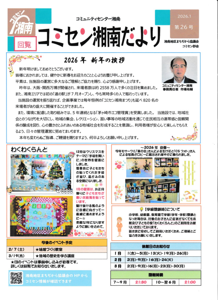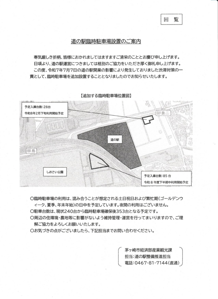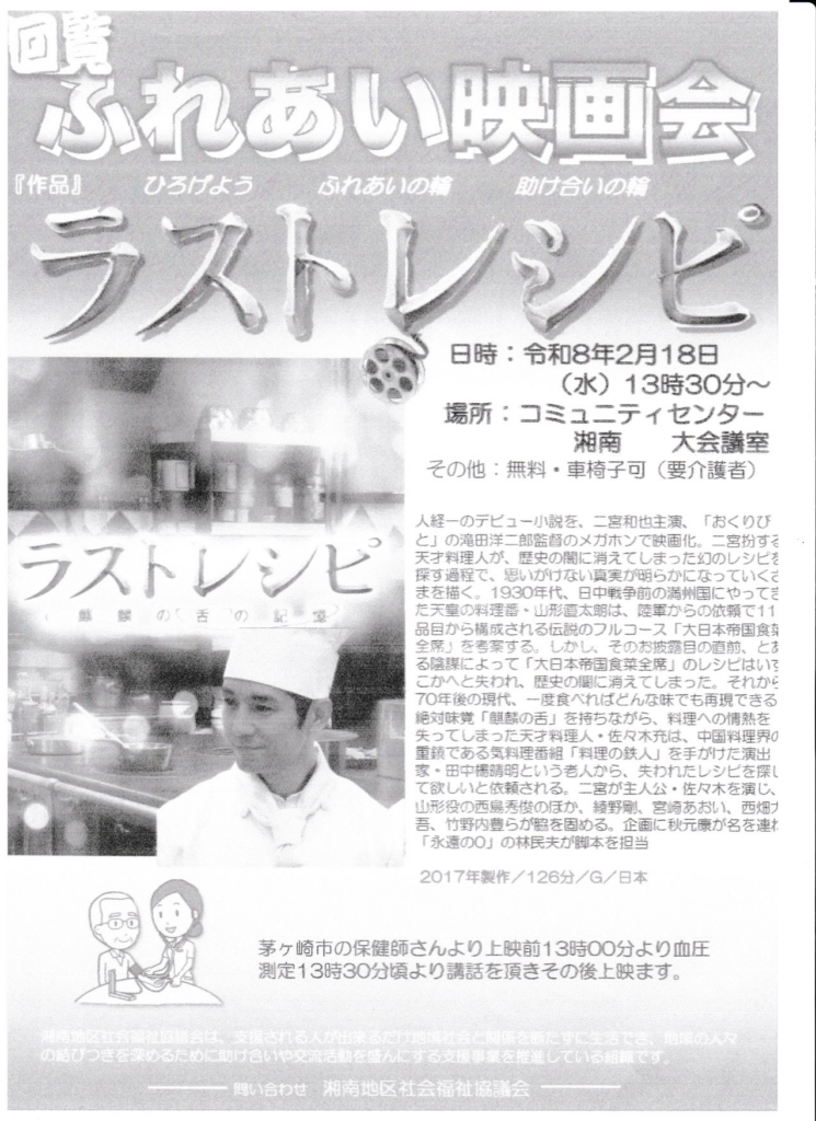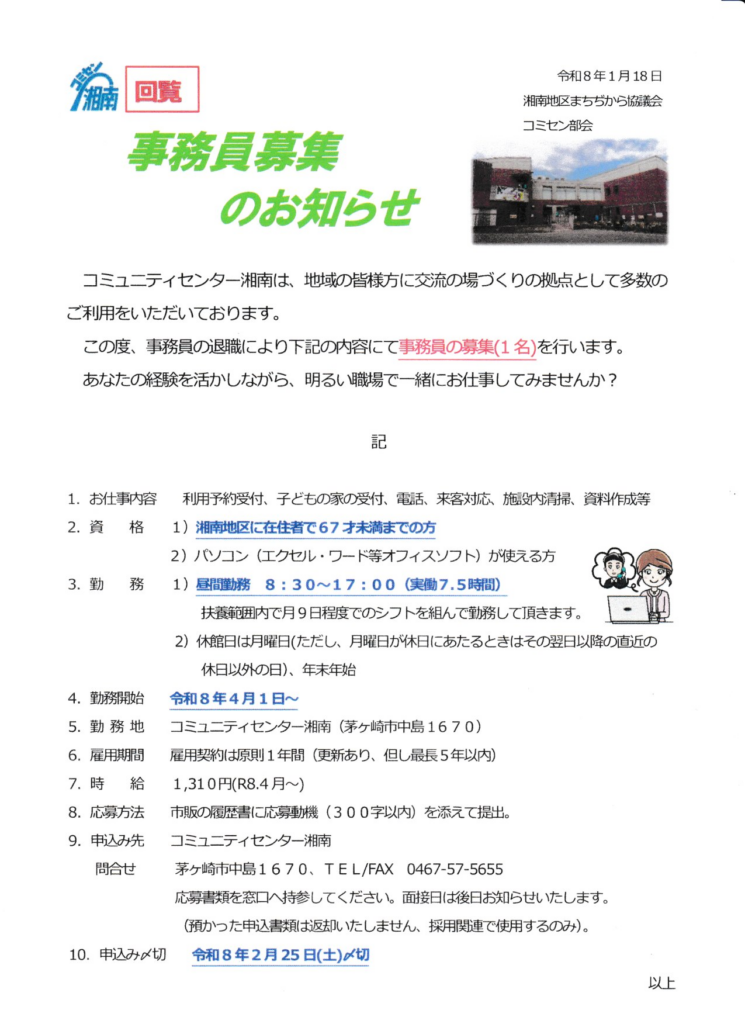 回覧(5件)「道の駅臨時駐車場設置の案内」「湘南 花の展覧会(道の駅)」「コミセン湘南だよい」「事務員募集のお知らせ(コミセン)」「ふれあい映画会『ラストレシピ』」